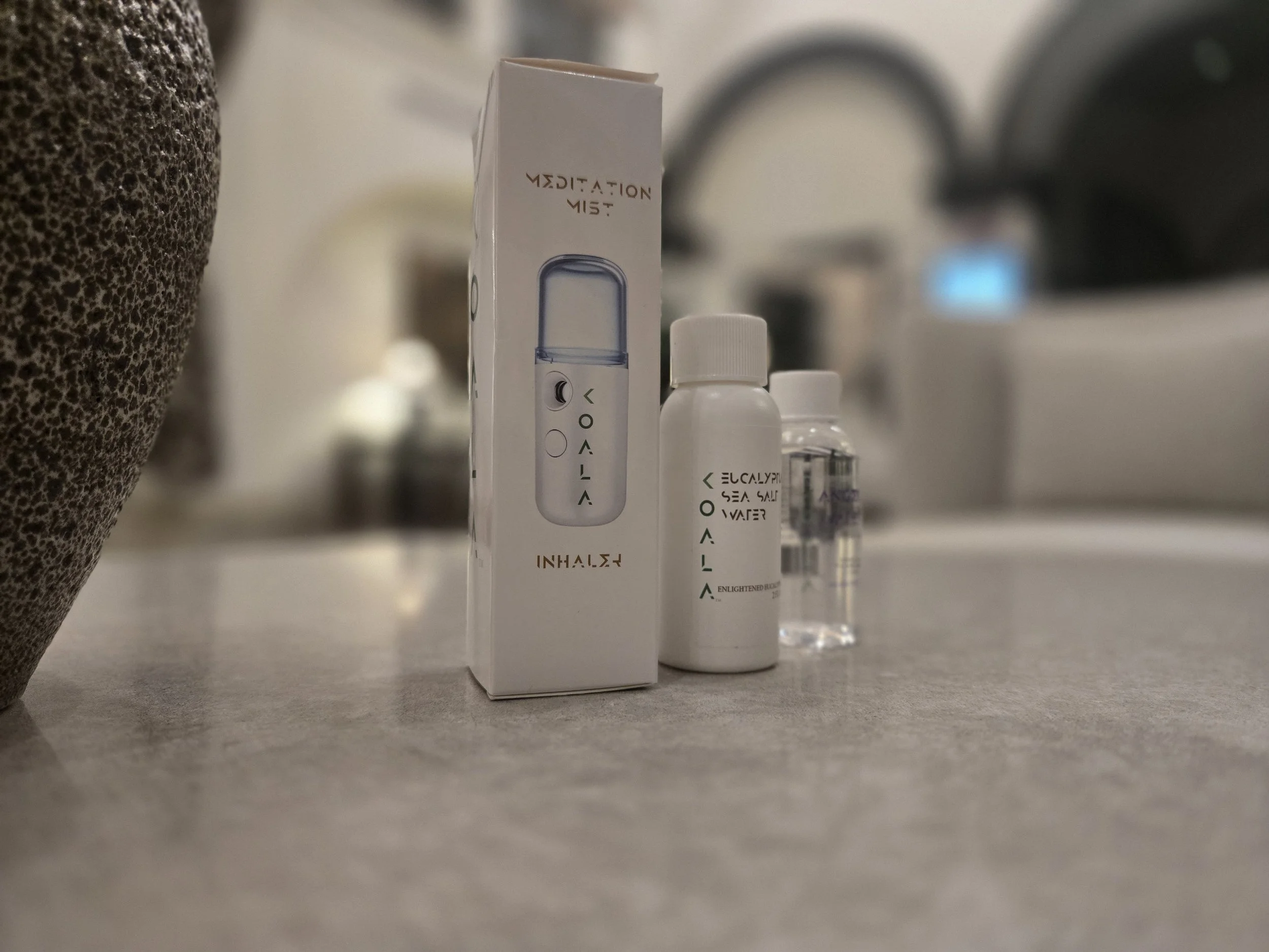 “This is so much better. Small. Press a little button and then there’s that wonderful mist. Gets all that dry desert out of your throat. It’s called the Koala. Great Idea. Huh?! ”